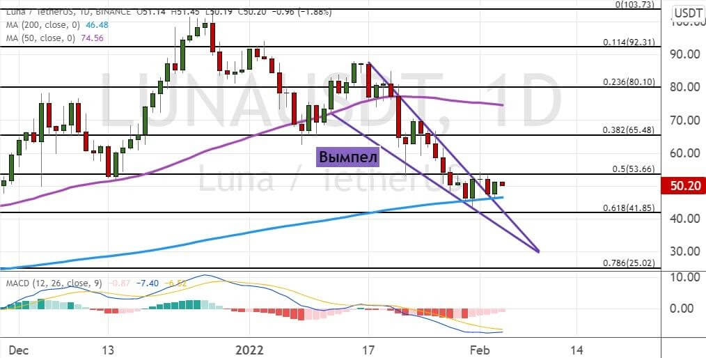 С большим отрывом на рынке DeFi лидирует LUNA проекта Terra. Сейчас криптовалюта демонстрирует консолидацию ниже важного сопротивления $54, что произошло после выхода котировок актива за верхнюю границу «Нисходящего вымпела» (модель обозначена на графике ниже линиями синего цвета). Первыми целями для быков выступают уровни $60 и $65 — выше последнего расположилась линия 50-дневной SMA.