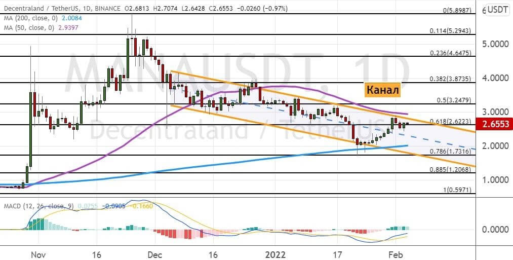 Безусловным лидером на рынке NFT по капитализации и росту остается MANA от виртуального мира Decentraland. Сейчас котировки этого актива пытаются закрепиться выше сопротивления $2.65, что откроет путь для роста к уровню $3. Здесь же расположены верхняя граница «Нисходящего канала» (модель обозначена на графике ниже линиями оранжевого цвета) и 50-дневная SMA. Первыми целями в случае развития бычьей динамики выступают уровни $3.25 и $3.80.