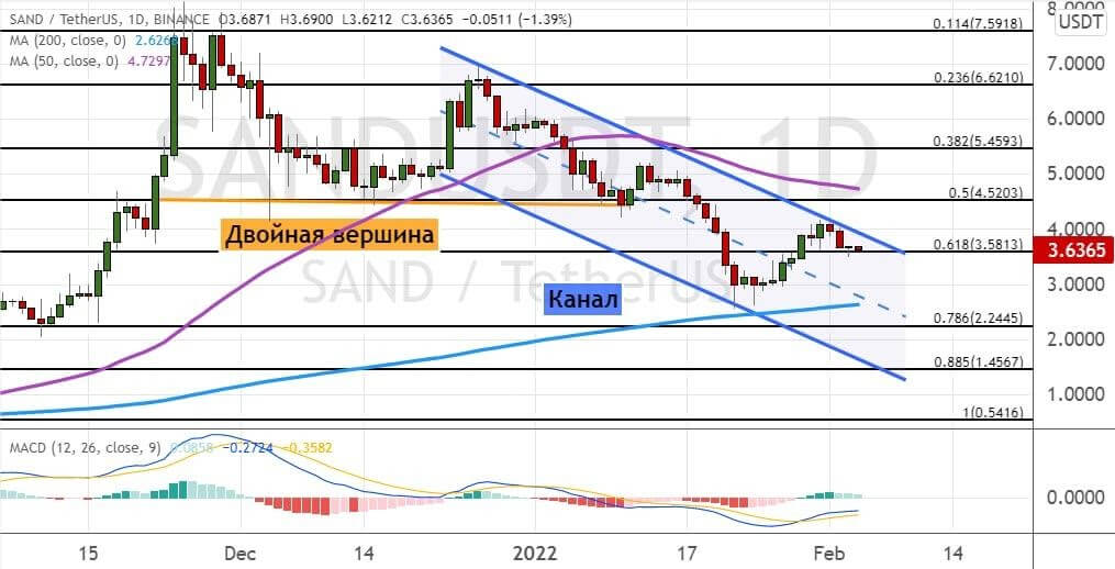 Развитие краткосрочного нисходящего тренда приведет к снижению стоимости SAND до первой цели $3, ниже которой расположилась линия 200-дневной SMA. Более глубокая коррекция приведет к обвалу до уровней $2.5 и $2. В пользу этого указывает модель теханализа «Двойная вершина».