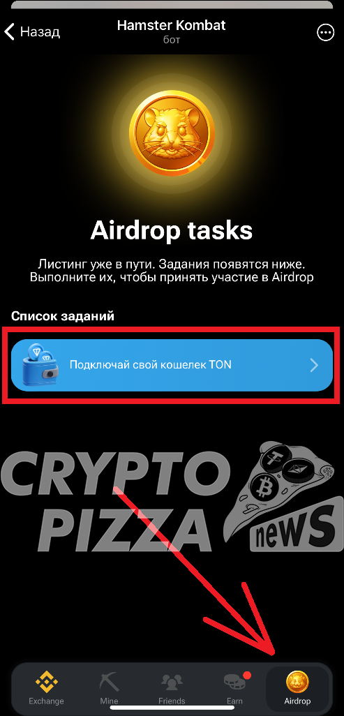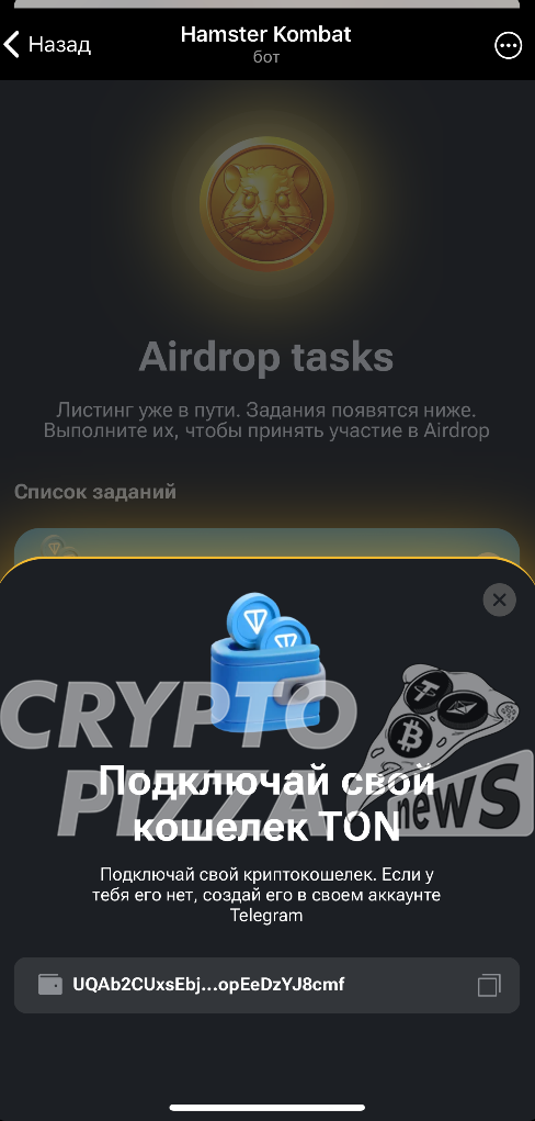 И последний шаг на пути к получению аирдропа — привязка кошелька в хомяке.