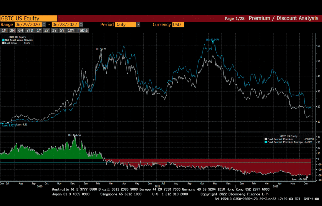 На графике выше представлены уровни премиума и дисконта GBTC в сравнении с чистой стоимостью активов (Net Asset Value, NAV). Учитывая шестимесячный срок и склонность людей экстраполировать краткосрочные тренды до бесконечности, я готов поспорить, что многие компании взяли кредиты в BTC, чтобы создать акции GBTC в надежде получить через шесть месяцев 40-процентный профит. И, как вы видите, эти надежды не оправдались, потому что акции GBTC торгуются с дисконтом со второго квартала 2021 года.