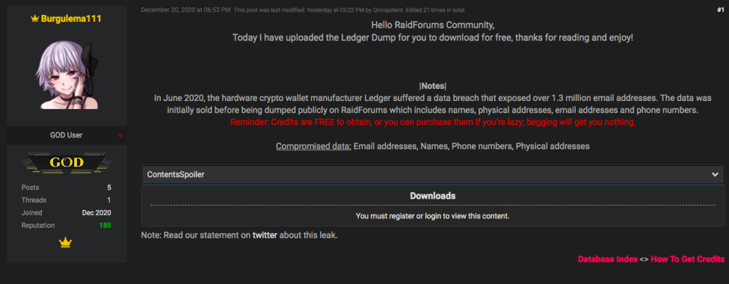 20 декабря данные пользователей Ledger были опубликованы на хакерском форуме Raidforums, после чего разлетелись по аналогичным сообществам. Утечку обнаружили сотрудники Cyble — компании, занимающейся кибербезопасностью. Они поделились информацией с изданием Bleeping Computer и совместно убедились в ее достоверности. Судя по всему, базой данных пользователей Ledger торгуют в Даркнете еще с лета. 21 декабря глава Ledger Паскаль Готье подтвердил подлинность утекшей информации и предположил, что хакеры опубликовали базу данных, украденную в июне этого года.