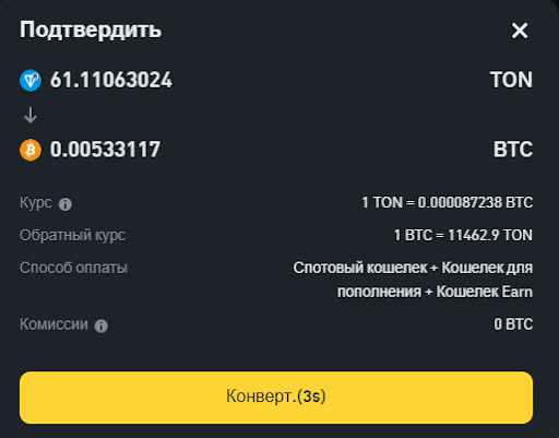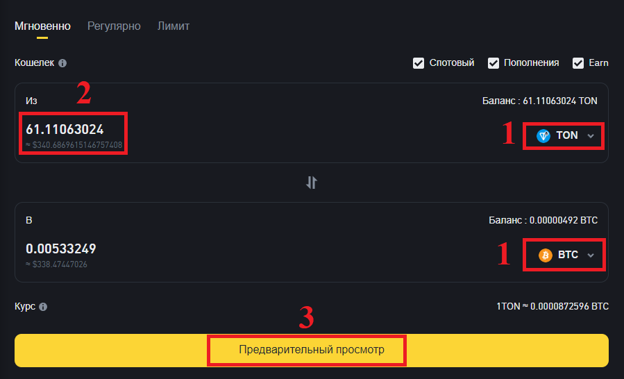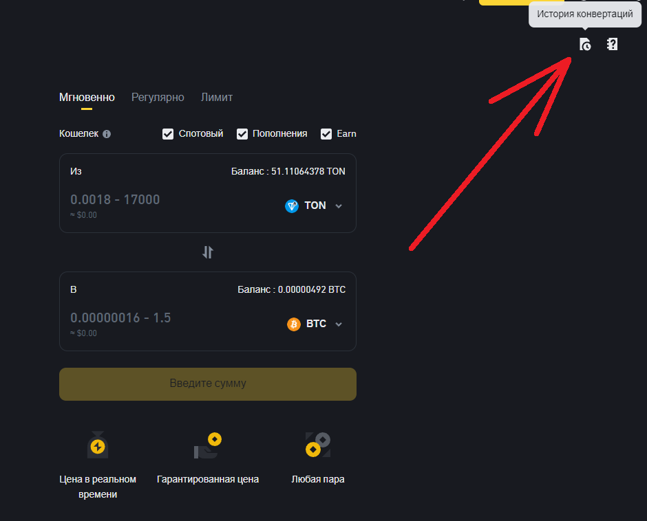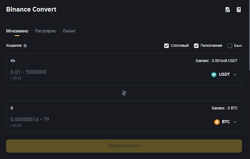 Для обмена можно использовать средства со спотового кошелька, кошелька для пополнения или баланса Earn