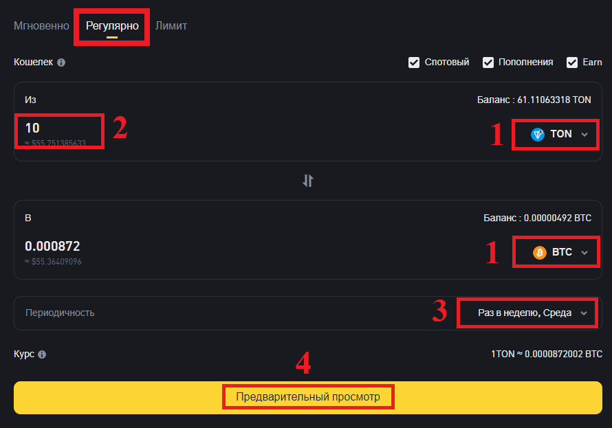 Режим регулярных покупок позволяет эффективно применять стратегию усреднения долларовой стоимости (DCA), плавно наращивая свои криптоактивы и усредняя цену входа.