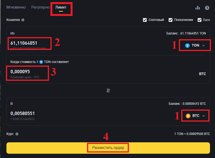 • Лимитный ордер выполняет конвертацию по установленной цене.