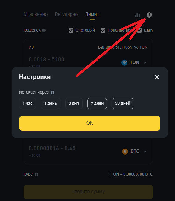 При нажатии на часы в правом верхнем углу можно установить время действия ордера. Если цена не достигнет указанной цены за отведенное время, ордер будет отменен.