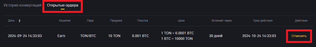 Там же ордер можно отменить в разделе «Открытые ордера».