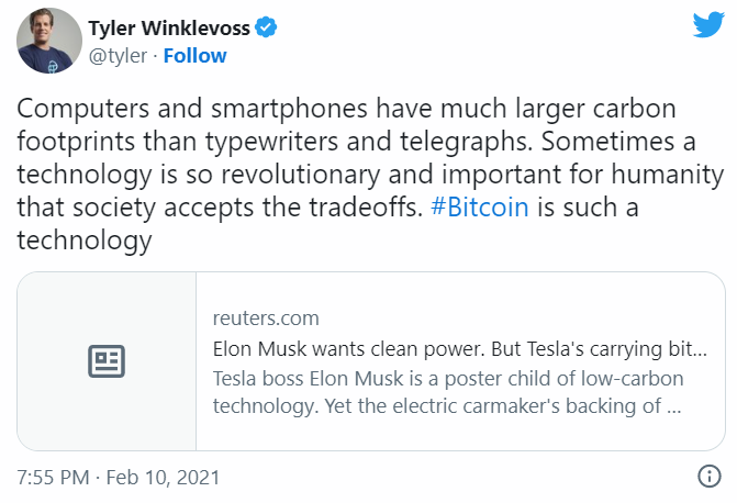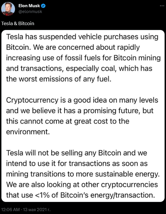 Но спустя всего полтора месяца компания выпустила заявление, где отметила, что «обеспокоена растущим использованием ископаемого топлива, необходимого для майнинга биткоинов и проведения транзакций с ним, прежде всего, угля, который наиболее вреден для экологии». Компания продолжает верить в будущее биткоина, но «это не должно вредить экологии».