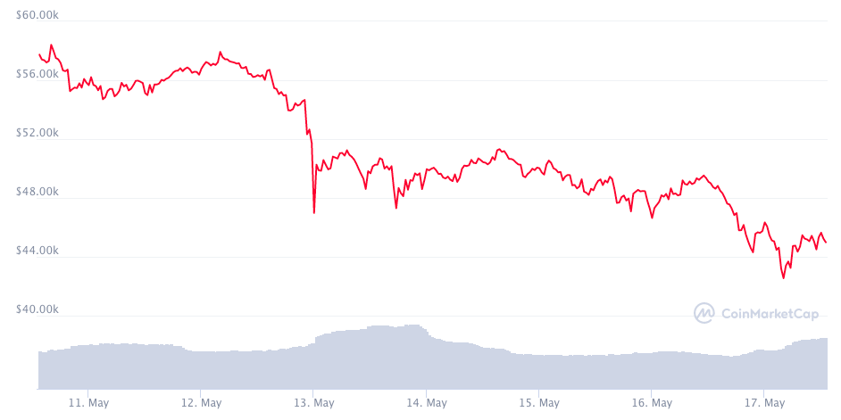 Крипторынок ожидаемо отреагировал на заявление Tesla падением: биткоин упал на 19% — с почти $58 000 до $46 960 — самого низкого уровня с февраля. Распродажа коснулась и других монет: ЕТН потерял 10%, BNB — 11%, DOGE— 12%. Акции Tesla потеряли свыше 5%.
