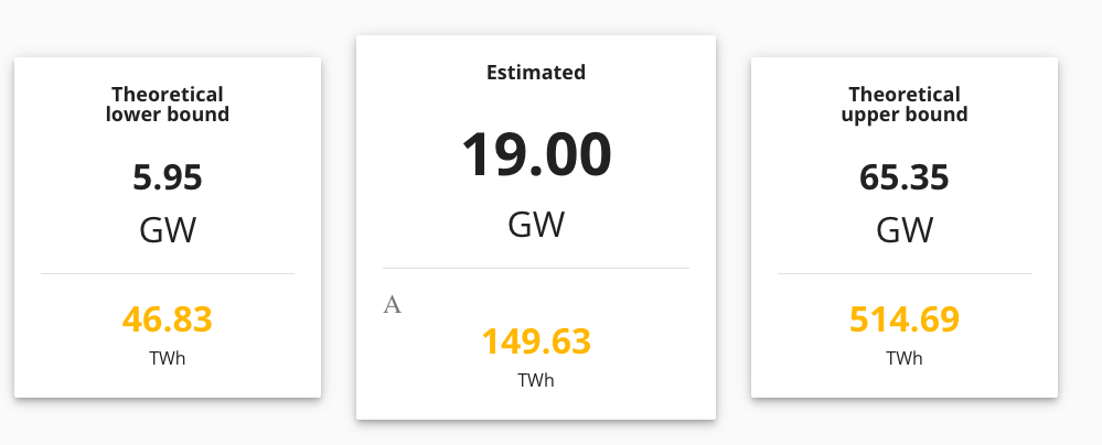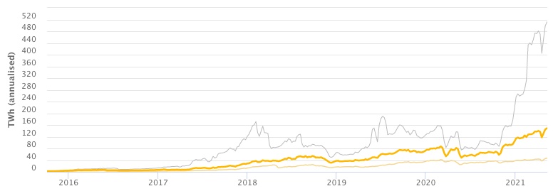 При этом погрешность оценки этого индекса поражает — предполагаемые минимум и максимум различаются в 11 раз, от 46.83 ТВт·ч до 514.69 ТВт·ч соответственно. Нижняя граница предполагает, что все майнеры постоянно используют наиболее энергоэффективное оборудование, а верхняя — что они используют наименее эффективные устройства. Наиболее вероятным уровнем считается 149.63 ТВт·ч. Это 0.69% от общей электроэнергии, потребляемой в мире, по данным за 2016 год.