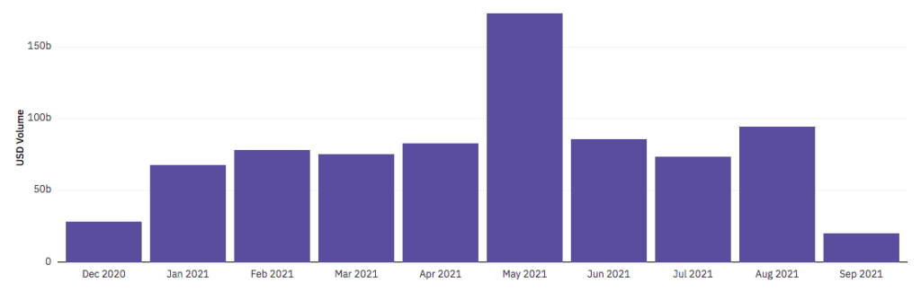 Месячный объем торгов DEX в 2021 году в среднем составил порядка $75 – $80 млрд в месяц, хотя в мае этот показатель превысил $173 млрд (в августе — $94.5 млрд). Для сравнения, суточный объем торгов только на одной централизованной криптобирже Binance превысил $28 млрд.