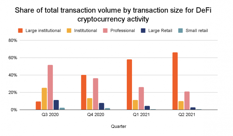 По данным августовского отчета компании Chainalysis, публикующей Глобальный индекс принятия криптовалют, самая высокая активность в DeFi приходится на тех игроков, которые проводят крупные транзакции.