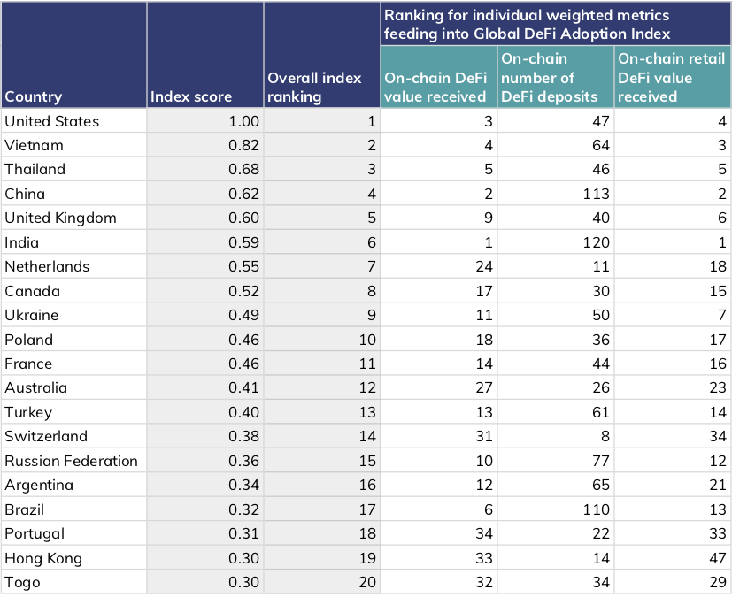 Рейтинг стран по принятию DeFi на основе нескольких показателей по данным Chainalysis. Источник