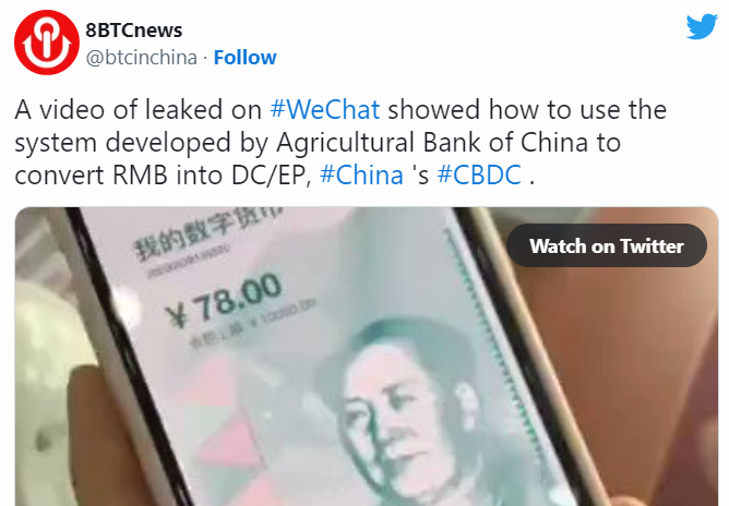 «Видео, просочившееся в WeChat, показывает систему для конвертации юаня в DCEP, разработанную для Сельскохозяйственного банка Китая», — опубликовало ролик новостное издание 8BTC News.