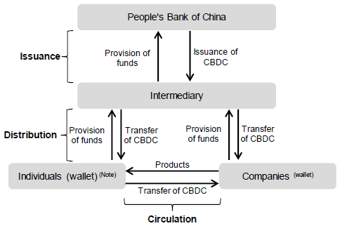 DCEP будет распределяться по двухуровневой системе. НБК выпускает цифровую валюту и распространяет ее среди розничных банков и финансовых организаций (Alibaba, Tencent и UnionPay), а те — среди жителей страны и бизнеса. Главное отличие в обращении между цифровым и фиатным юанем в том, что DCEP будет переводиться через специальные кошельки, а не через банковские счета.
