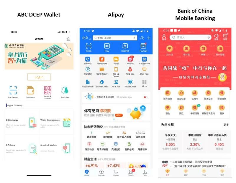 Изображения кошелька DCEP и его интеграции в приложении Alipay и Bank of China. Источник.