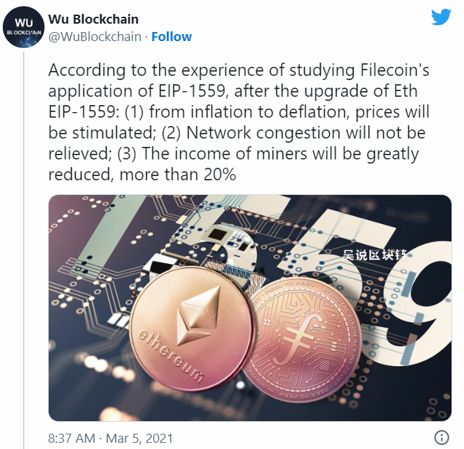 Журналист Колин Ву считает, что на основе опыта по внедрению обновления, аналогичного EIP-1559, в проект Filecoin, «1 — дефляция будет стимулировать рост цены монеты; 2 — сеть останется перегруженной; 3 — доходы майнеров сократятся более чем на 20%». Источник