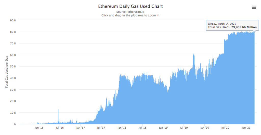 График выше отчетливо иллюстрирует одну из главных проблем Ethereum — рост общего объема комиссий, которые платят пользователи сети майнерам. Среди причин такого взрывного роста: бычий тренд на крипторынке, увеличение числа пользователей экосистемы Ethereum, бум на рынке DeFi-протоколов, а также выпуск и оборот миллиардов Tether — стейблкоина, большая часть которого работает на базе Ethereum.
