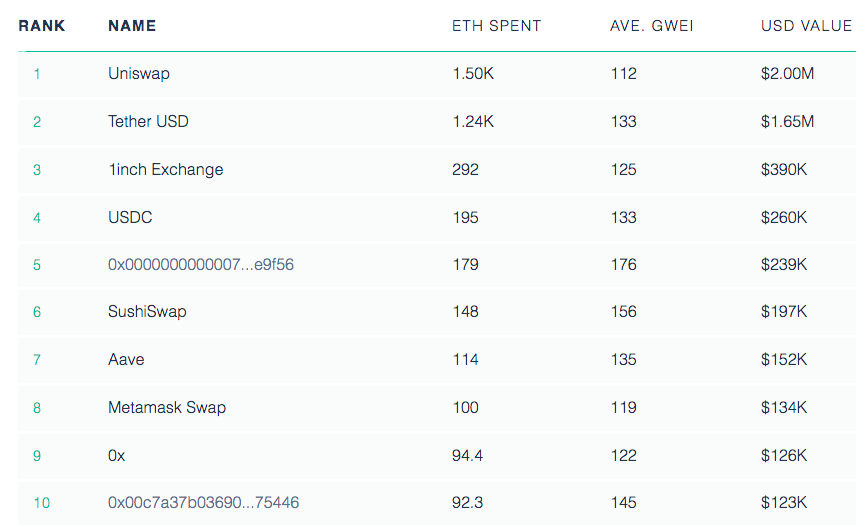 10 самых крупных потребителей газа. Среди лидеров — стейблкоины USDT и USDC и DeFi-приложения. Источник.