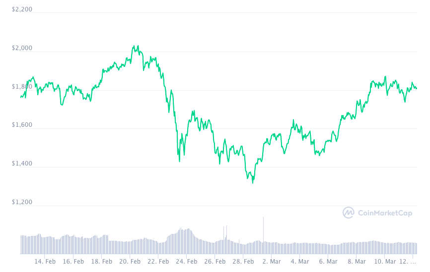 График цены ЕТН за последний месяц. После объявления об активации EIP-1559 курс монеты вырос на 20%. Источник.