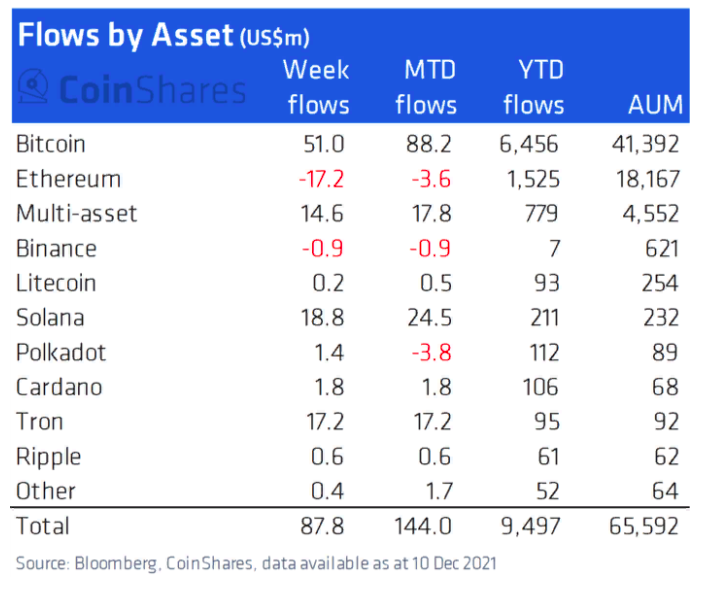 К похожим выводам пришли и аналитики криптовалютой инвестиционной платформы CoinShares, которая еженедельно мониторит объем институциональных вложений в криптосектор. Так, по данным CoinShares, помимо Bitcoin и Etherium инвесторы вкладываются в такие проекты, как Litecoin, Solana, Cardano, Polkadot, Binance Smart Chain, Tron и XRP.