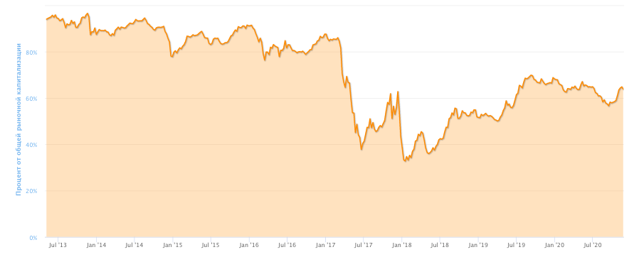 График изменения доминирования биткоина в процентах от общей рыночной капитализации. Считается, что одним из основных признаков сезона альткоинов является снижение доминирования биткоина. Источник
