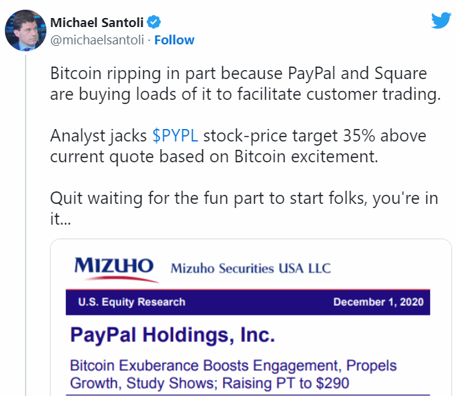 «Такой стремительный рост биткоина во многом обусловлен тем, что PayPal и Square покупают его в большом количестве, чтобы облегчить торговлю клиентам. По прогнозам аналитиков, справедливая цена акций PayPal благодаря вложениям в биткоин на 35% выше текущих котировок. Хватит ждать, когда начнется самое интересное, ребята, оно уже началось…», — написал финансовый журналист Майкл Сантоли.