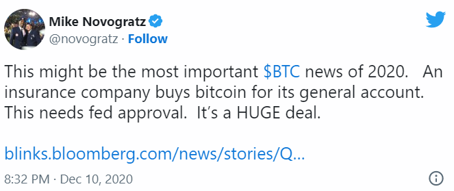 «Это может быть важнейшая для биткоина новость в 2020 году. Страховая компания покупает биткоин для своего общего инвестсчета. Сделка потребует одобрения ФРС. Это очень важно!», — написал миллиардер, крипто-инвестор и основатель криптобанка Galaxy Digital Майк Новограц.