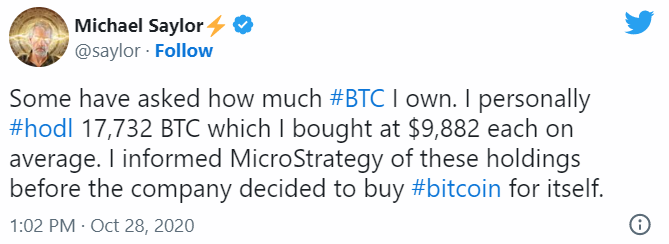 «Меня спрашивали, сколькими ВТС я владею. У меня есть 17 732 ВТС [$344 млн по сегодняшнему курсу], которые я купил в среднем по $9882 каждый. Я сообщил MicroStrategy об этом еще до того, как компания решила купить биткоин для себя», — поделился размерами собственного биткоин-состояния Майкл Сэйлор. Источник
