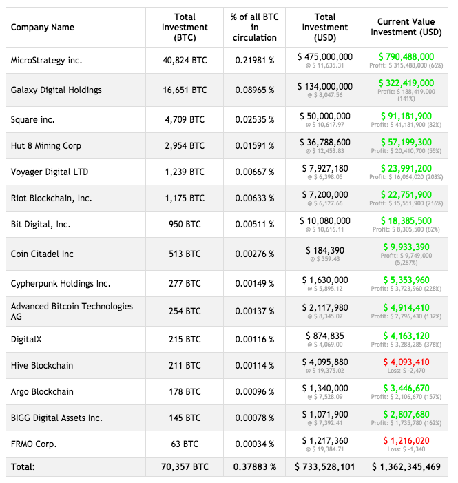 Список публичных компаний, вложившихся в криптовалюты, и размер их активов. Источник.