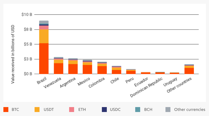 Согласно выводам Chainalysis, популярность криптовалют в Латинской Америке обусловлена такими факторами, как отсутствие доступа широкой части населения к банковским услугам, популярность криптовалют в международных переводах, а также девальвация местных фиатных валют и, как следствие, гиперинфляция.