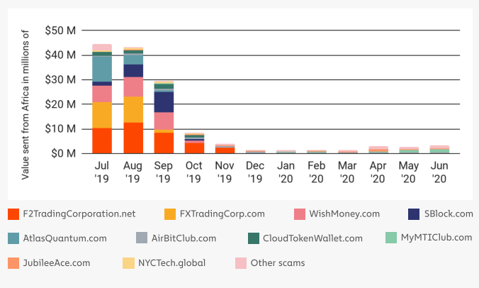 Высокий уровень криптопреступности. 2.4% от всех криптотранзакций региона — это преступные операции. В прошлом году в среднем по миру этот показатель составил 0.34%. Свыше 60% от всех преступных транзакций составляют скам-проекты, наиболее крупные из которых — F2TradingCorp, FXTradingCorp и WishMoney.
