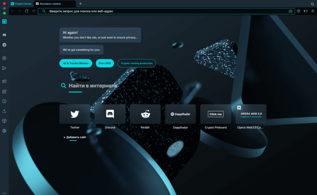Стартовая страница десктопного криптобраузера Opera с быстрым доступом к Twitter, Discord, Reddit, DappRadar