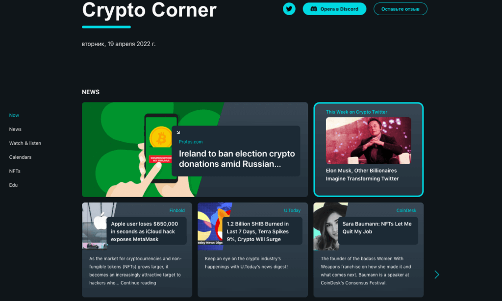 Crypto Corner — интеллектуальная стартовая страница, появляющаяся по умолчанию при запуске браузера. Здесь собраны новости из надежных криптоисточников, подборки подкастов и блогов, котировки криптоактивов и размер комиссий, NFT-галерея, объявления о проводимых аирдропах, календарь отраслевых событий, образовательные материалы и другая полезная информация из криптомира.
