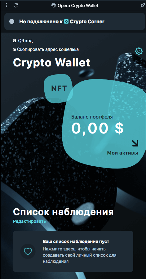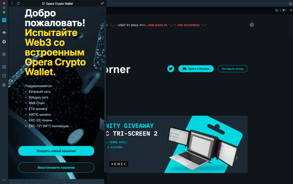Crypto Corner десктопного криптобраузера Opera