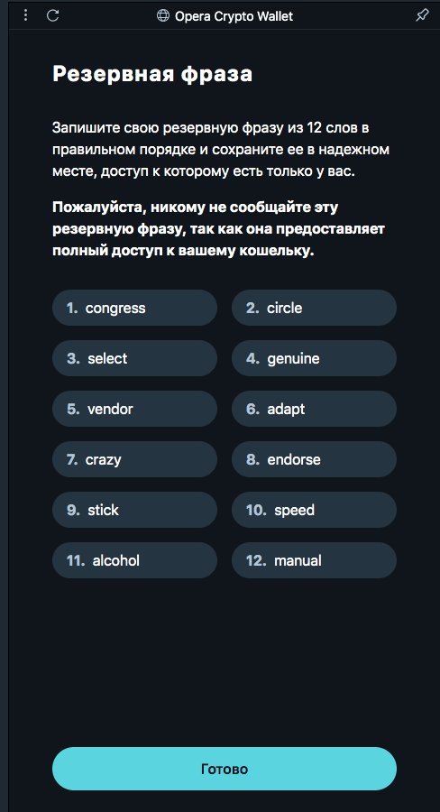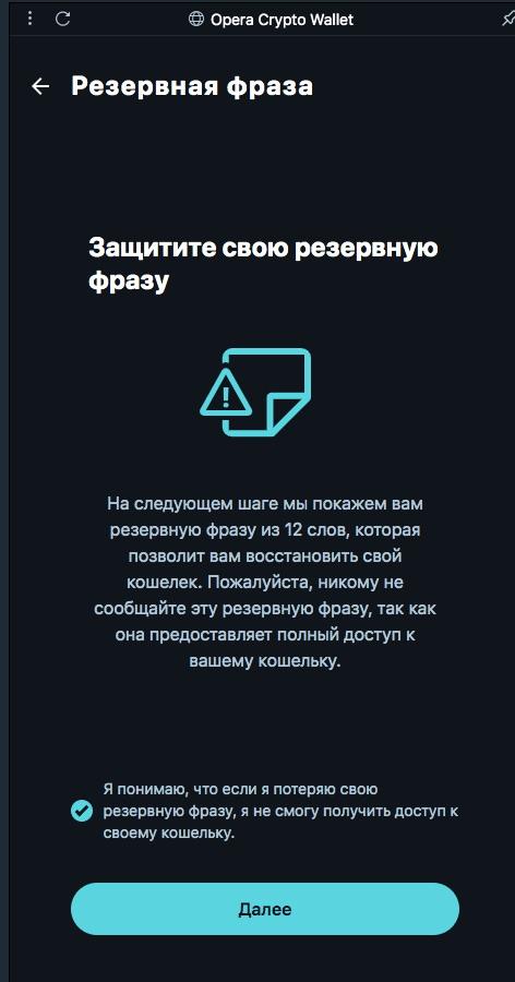 Пользователь может создать новый криптокошелек или же подключить уже существующий. При создании кошелька будет сгенерирована резервная seed-фраза: не теряйте ее и не показывайте посторонним — она понадобится для восстановления доступа к кошельку с другого устройства или при переустановке браузера.