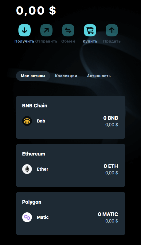 Пользователи встроенного криптокошелька могут проверять баланс и размер транзакционных комиссий, переводить цифровые активы друг другу, покупать их и хранить, а также управлять своими NFT-коллекциями.