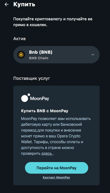 Купить криптоактивы можно с помощью платежного процессора MoonPay, позволяющего оплатить покупку банковской картой. ВАЖНО: с марта 2022 года компания прекратила работу с гражданами России, Беларуси и Украины.