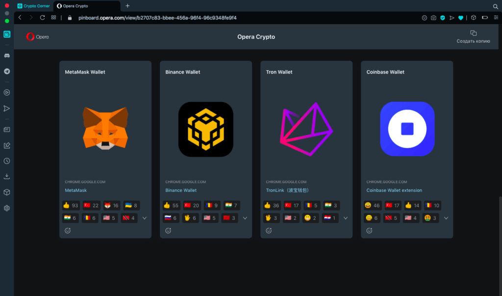 Pinboards десктопного криптобраузера Opera с обучающими материалами по использованию браузера
