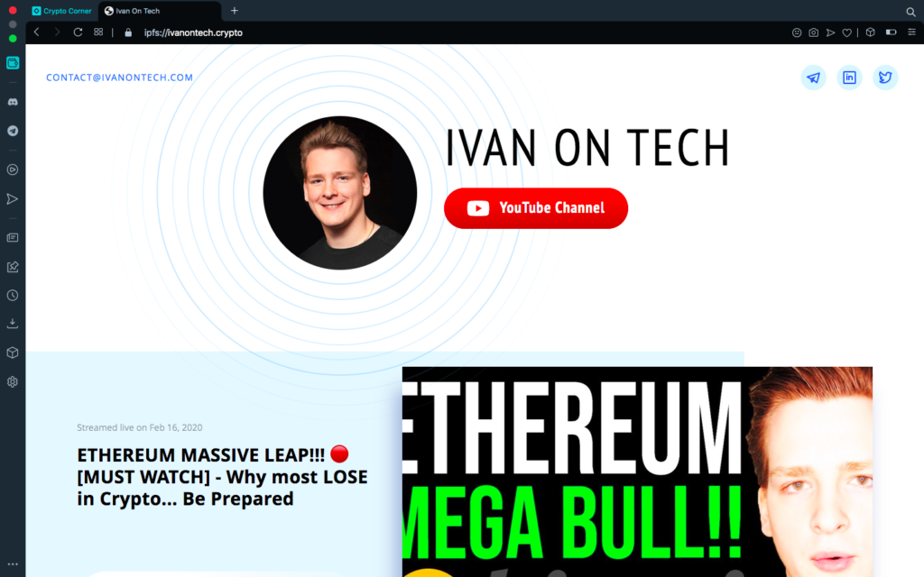Отображение в криптобраузере Opera сайта популярного криптоблогера Ivan On Tech на IPFS и домене ivanontech.crypto