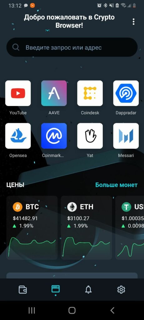 Стартовая страница мобильного криптобраузера Opera на Android. Интерфейс разделен на четыре вкладки: кошелек, стартовая страница, оповещения (например, изменения цен или важные новости), настройки
