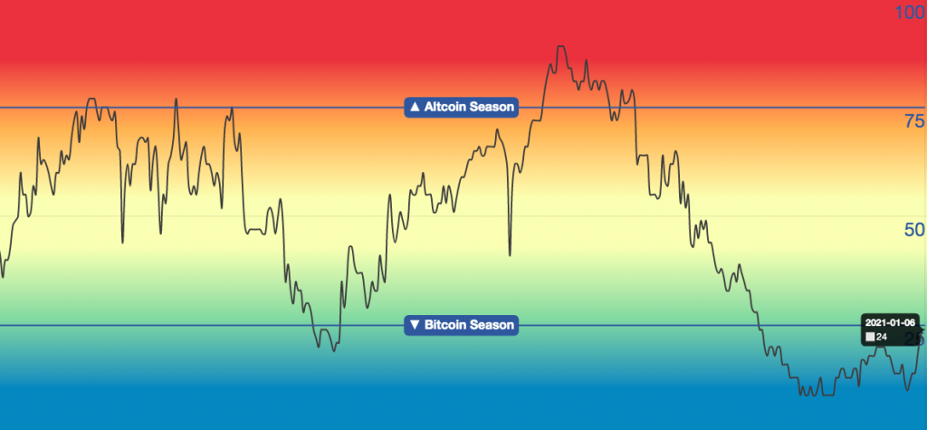 По состоянию на сегодня биткоин продолжает доминировать на рынке — индекс Altcoin Season Index находится на отметке 24 из 100.