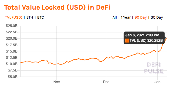 Говоря о рынке децентрализованных финансов, нельзя не отметить, что в 2020 году именно этот сектор крипто-отрасли развивался наиболее стремительно. В нем запустились многочисленные проекты, которые предоставляют широкий список финансовых услуг любому пользователю, подключенному к сети Интернет. Так, если год назад сумма заблокированных в DeFi-протоколах средств составляла всего $658 млн, то к началу 2021 она подскочила до $20.28 млрд.