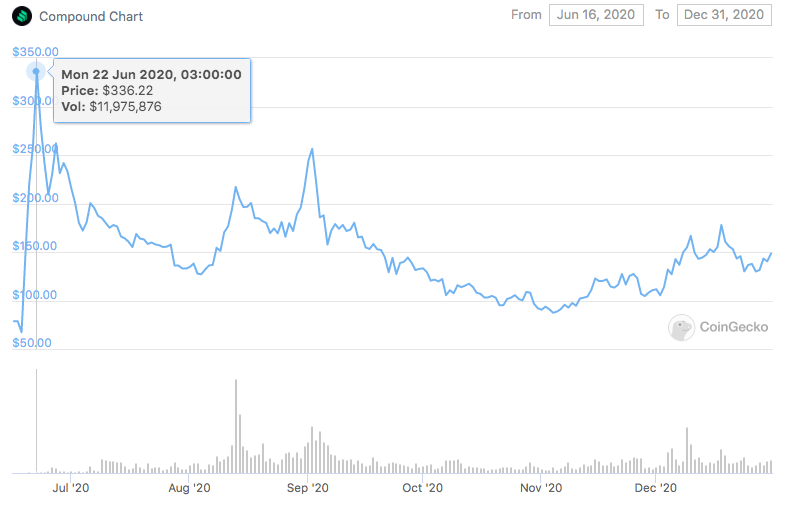 Сначала токены COMP были распределены только среди крупных игроков DeFi-рынка и акционеров компании Compound, однако 16 июня началась раздача токенов COMP пользователям платформы. В результате в первые же часы торгов цена COMP взлетела до $230, а к 22 июня токен уже стоил более $336.