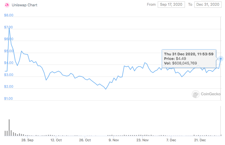 16 сентября Uniswap запустила токен управления UNI для поставщиков ликвидности площадки. Тогда UNI были распределены между 50 000 адресами кошельков в сети Ethereum, что сделало этот актив одним из самых распространенных токенов крипторынка. В результате курс UNI уже 18 сентября достиг максимума на уровне $8.60. Сейчас актив торгуется в районе $6.38.