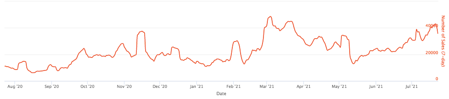 По информации того же сервиса Nonfungible, общее количество еженедельных продаж NFT, даже несмотря на глубокое падение в конце мая, сейчас находится недалеко от исторического максимума. Так, в начале года на каждой неделе на рынке проходило около 14 800 сделок с NFT, на пике (в начале марта) — 48 600, на локальном минимуме (в мае) — меньше 13 000. А сейчас данный показатель уже превышает более 35 000 сделок за неделю.