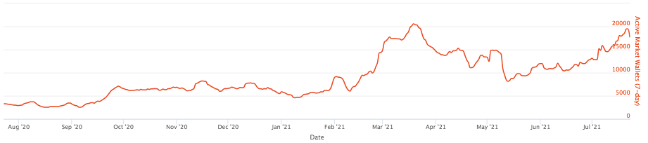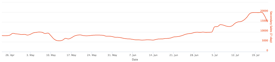 Вторичный рынок NFT также достиг своего максимума в 28 570 сделок в начале марта, после чего медленно снижался до середины мая до 5 700 сделок в неделю. За два с половиной месяца медленного роста этот показатель достиг 15 000 — 19 000 сделок в неделю.