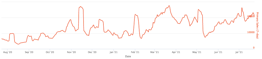 Число первичных продаж по сравнению с максимумом в 27 690 также выросло. В начале июля оно составляло свыше 26 390, а сейчас — свыше 20 600.