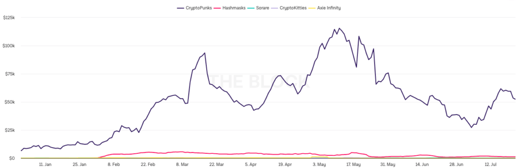 Средняя цена продаж в 5 NFT-проектах с наиболее дорогими NFT, по данным The Block. Очевидный лидер — CryptoPunks. Источник.
