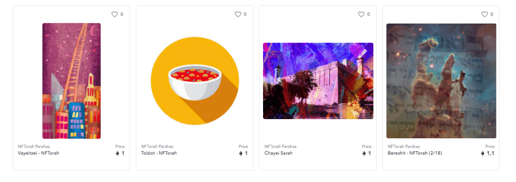 В июле два раввина (Джонатан Карас в Иерусалиме и Мордехай Лайтстоун в Бруклине) запустили проект «NFTorah». Пользователи могут купить один из NFT, посвященных Торе (священная книга иудаизма) — вся прибыль пойдет на создание физических свитков текста, которые будут отправлены еврейским общинам. Сейчас авторы собираются запустить продажу NFT, привязанных к отдельным буквам в рукописном свитке Торы. Такие свитки изготавливают вручную, они стоят до $50 000.